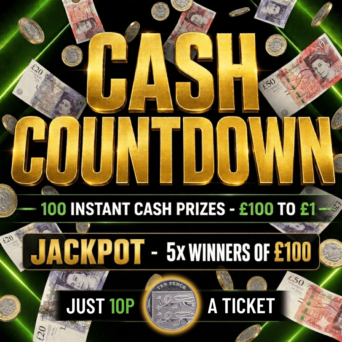 Grab your tickets for just 10p each and be in with a chance of winning instantly from a massive 100 instant cash prizes, starting at £100 and counting all the way down to £1.